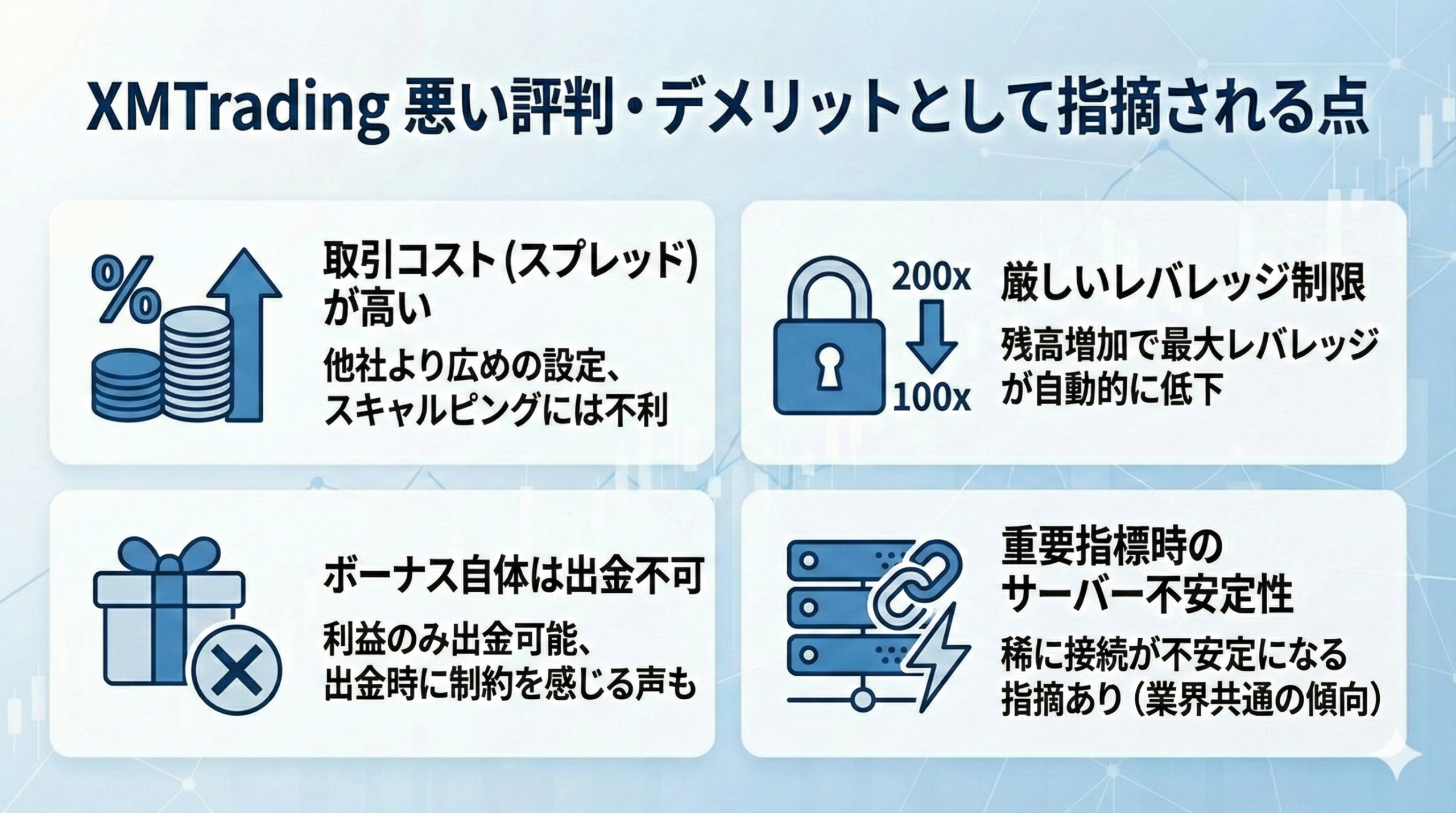 反対に、取引コストを最小限に抑えたいスキャルピング中心のトレーダーや、大口資金で高レバレッジを維持したい上級者からは、スプレッドの広さやレバレッジ制限に対する不満が目立ちます。