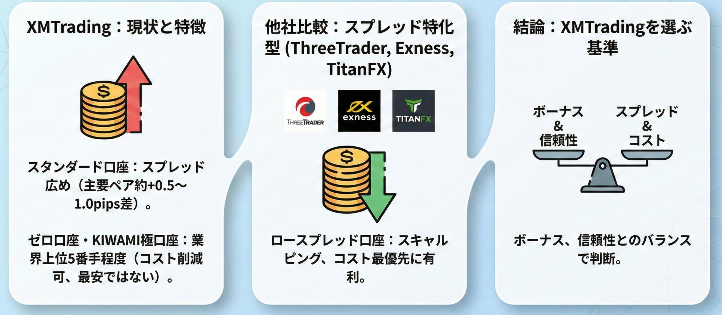 ボーナス重視で安定した取引環境を求めるならXMTrading、取引コスト重視ならTitanFXやAXIORY、両者の中間を求めるならFXGTといった形で、自分の優先順位に応じて業者を選択する考え方が実用的です。